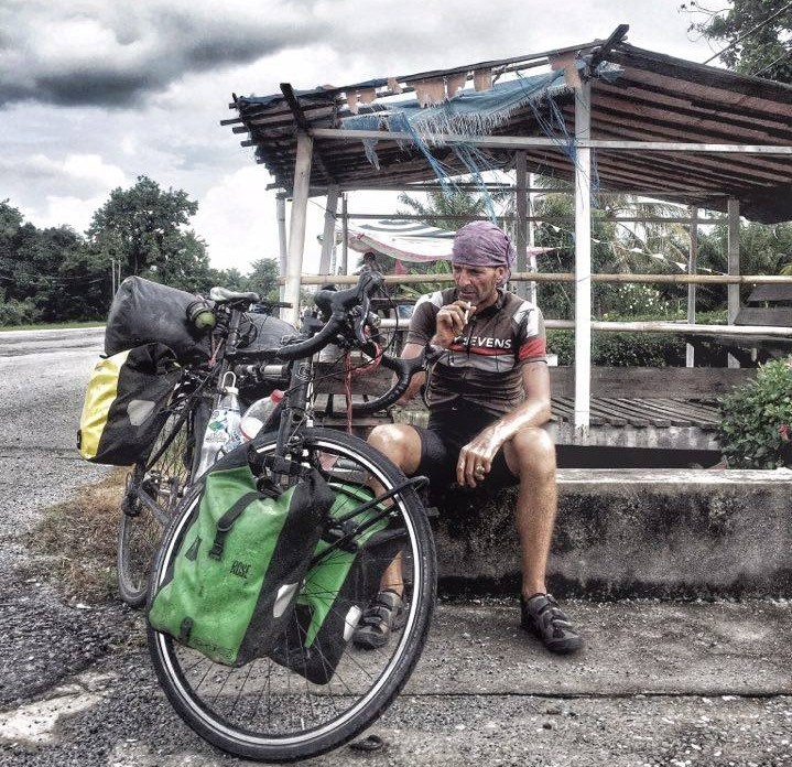 Fue entonces cuando este hombre se replanteó muy seriamente si seguir con aquel tipo de vida o comenzar una nueva, alejada de todo aquello que le había estado acompañando durante sus 45 años de vida. De modo que el día 31 de Marzo del año 2014, decidió vender su pequeño negocio, cogió su bici, la equipó con un par de alforjas a los lados y empezó a pedalear y pedalear... y pedalear...